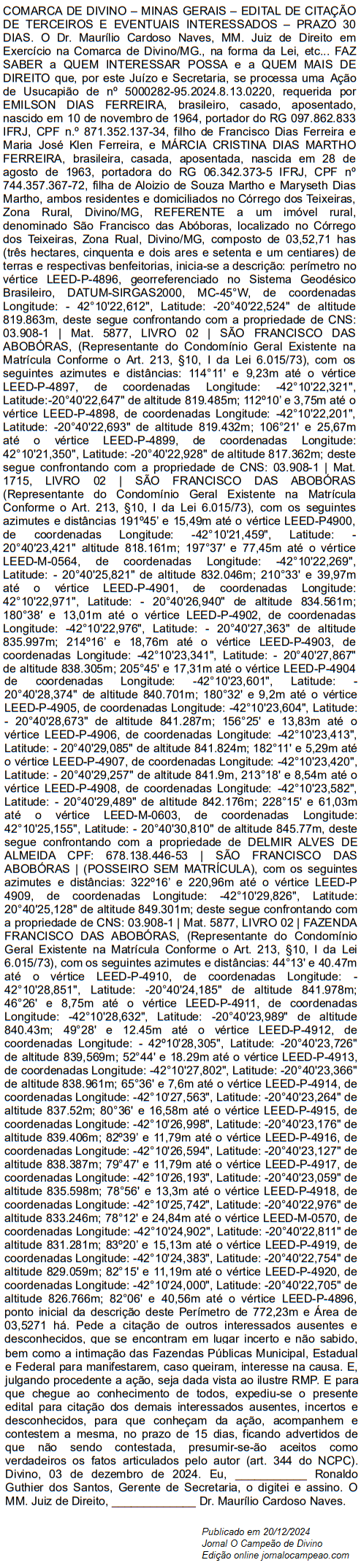 Edital de Citação de Terceiros e Eventuais Interessados -201224 Comarca de Divino-MG